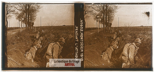 Montdidier, infanterie, guerre WW1, plaque verre, photo ancienne stéréo 6x13 cm