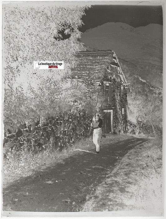 Montagne, maison, Plaque verre photo stéréo, positif noir & blanc 6x13 cm