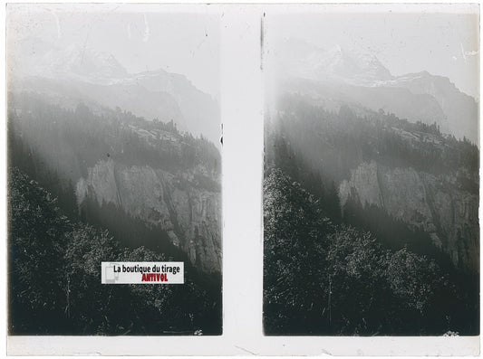 Montagne, Plaque verre photo stéréoscopique, négatif noir & blanc 4,5x10,7 cm
