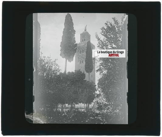Mosquée Koutoubia, Marrakech, photo ancienne plaque verre, positif 8,5x10 cm