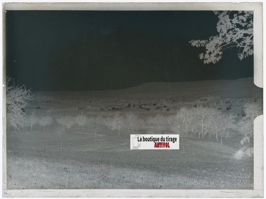 Paysage, village, photo ancienne plaque verre, négatif noir & blanc, 9x12 cm