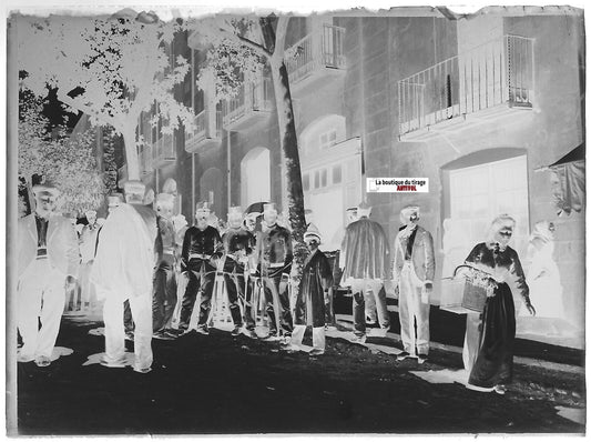 Perpignan, soldats, Plaque verre photo ancienne, négatif noir & blanc 9x12 cm