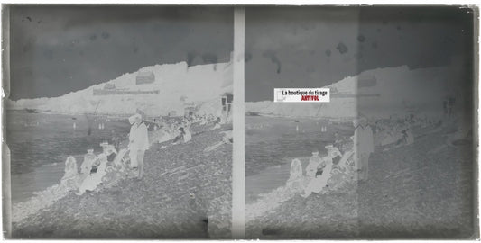 Perros-Guirec plage, Bretagne, stéréoscopie, photo plaque verre, négatif 9x18 cm