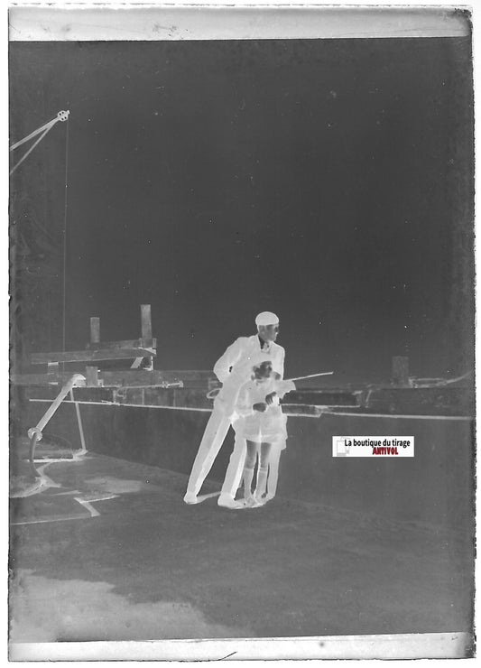 Père et fils, béret, Plaque verre photo ancienne, négatif noir & blanc 6x9 cm