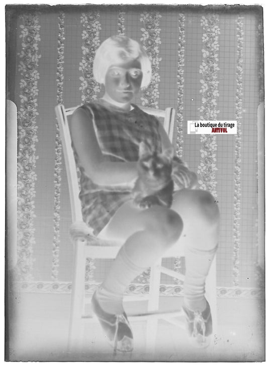 Petite fille chat, Plaque verre photo ancienne, négatif noir & blanc 6x9 cm