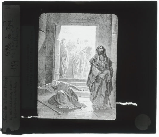 Pharisien et le publicain, Bible Doré, dessin, plaque verre, positif 8,5x10 cm