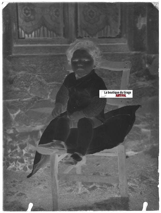 Petite fille, chaise, plaque verre photo ancienne, négatif noir & blanc 9x12 cm