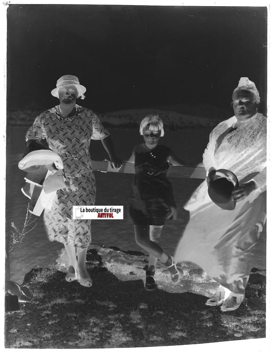 Petite fille, mer, Plaque verre photo ancienne, négatif noir & blanc 9x12 cm