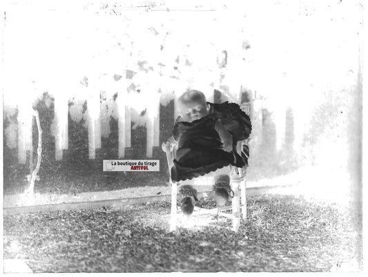 Plaque verre photo ancien négatif noir et blanc 9x12 cm enfant bébé fauteuil