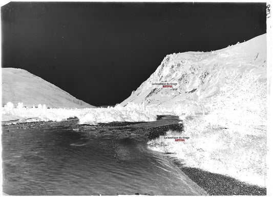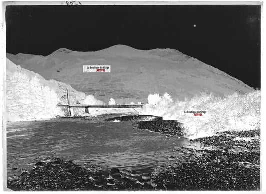 Plaque verre photo ancienne négatif noir et blanc 13x18 cm Bielle montagne eau