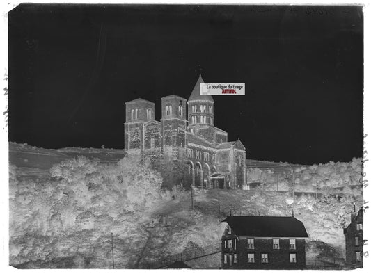 Plaque verre photo ancienne négatif noir et blanc 13x18 cm Saint-Nectaire église