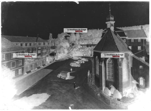 Plaque verre photo ancienne négatif noir et blanc 13x18 cm Trimbach église