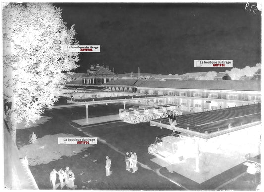 Plaque verre photo ancienne négatif noir et blanc 13x18 cm Vichy gare SNCF bus
