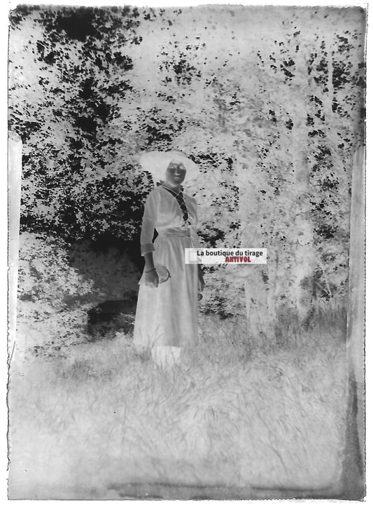 Plaque verre photo ancienne négatif noir et blanc 6x9 cm femme chapeau nature