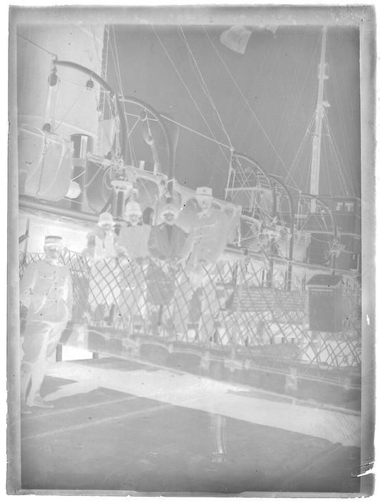 Plaque verre photo ancienne noir et blanc négatif 9x12 cm soldat bateau vintage