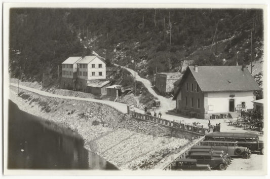 Plaque verre photo ancienne positif noir & blanc 13x18 cm Vittel hôtel camions