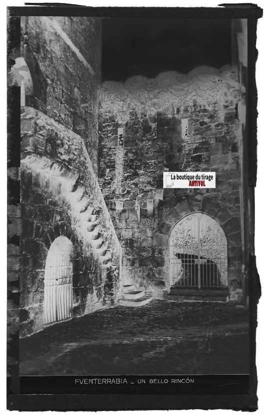 Plaque verre photo vintage négatif noir & blanc 9x14 cm Fuenterrabia, ruelle