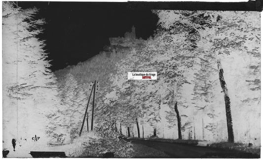 Plaque verre photo, négatif noir & blanc 9x14 cm, Dabo, Chapelle et hôtel, route