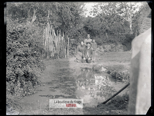 Portrait de famille, eau, plaque verre, photo ancienne, négatif 9x12 cm