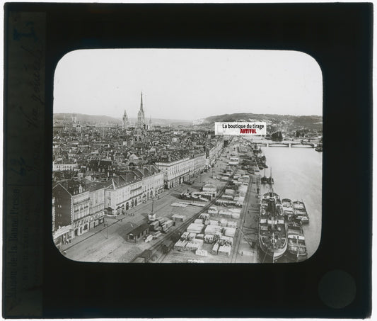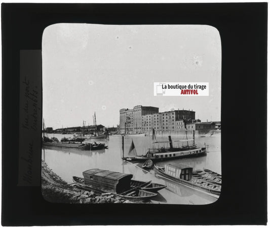 Port de Rouen, bateaux, photo plaque verre, noir & blanc, positif 8,5x10 cm