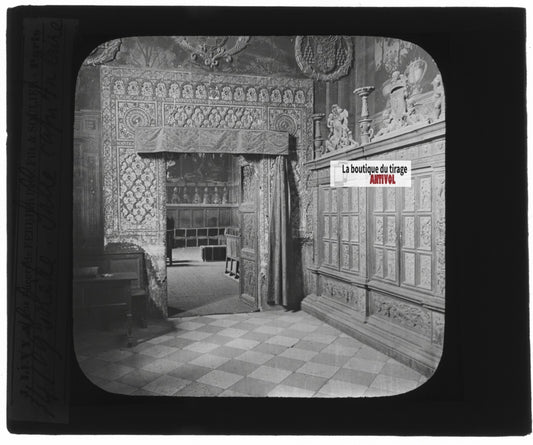 Salle Garde, château Loire, photo ancienne plaque de verre, positif 8,5x10 cm
