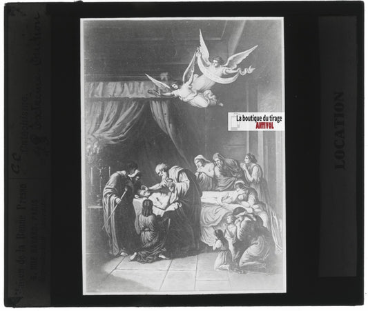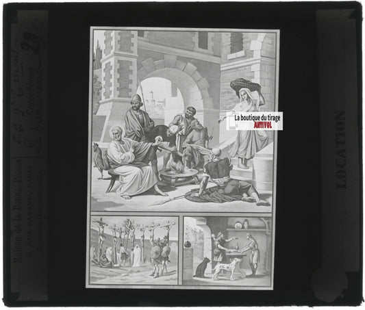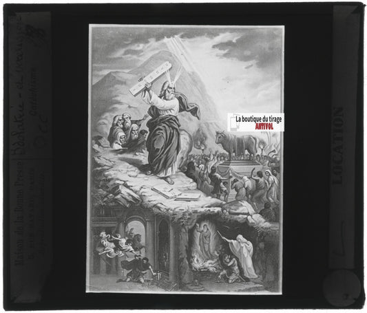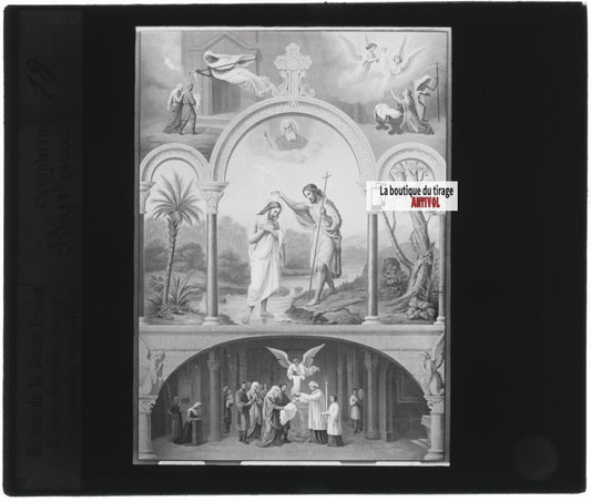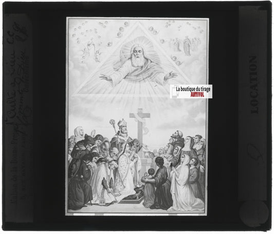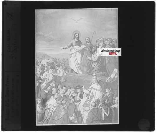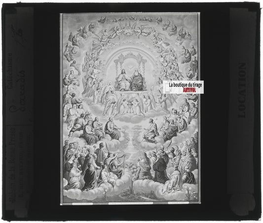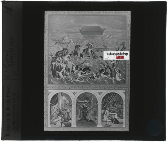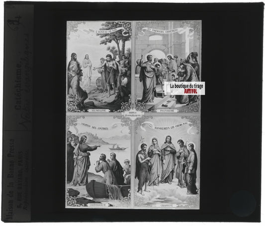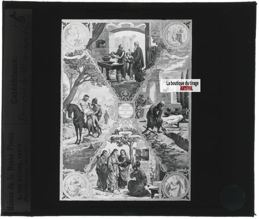 Scène religieuse, catéchisme, dessin peinture, plaque verre, positif 8,5x10 cm