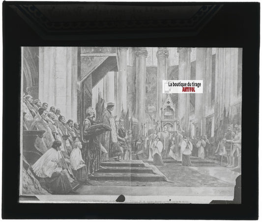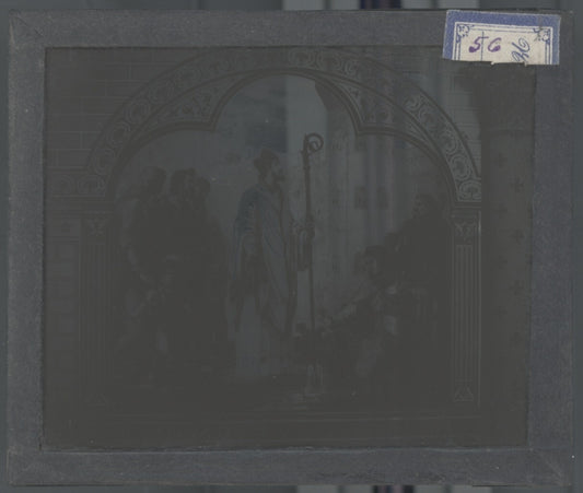 Scène religieuse, Louis XI, dessin peinture, plaque verre, positif 8,5x10 cm