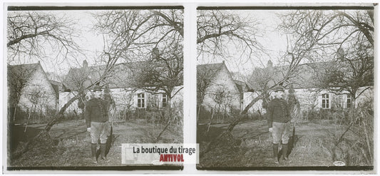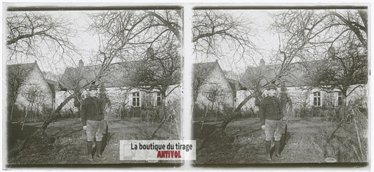 Soldat français, verger, guerre WW1, plaque verre photo ancienne stéréo 6x13 cm