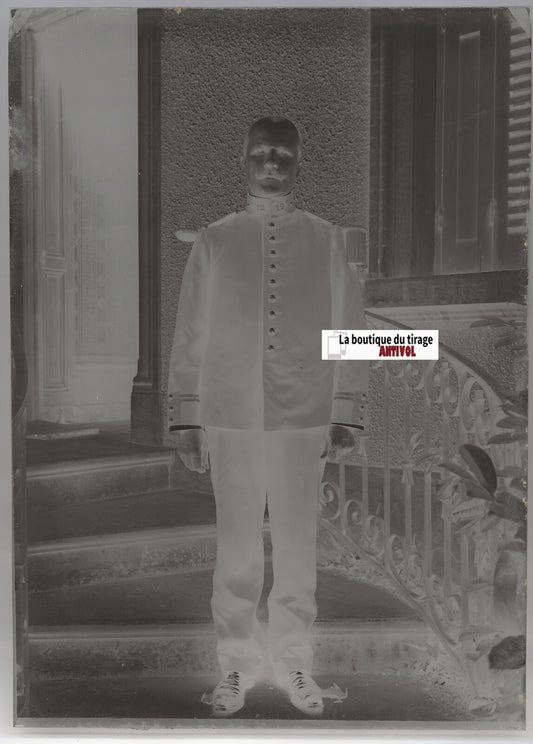 Soldat, uniforme, plaque verre photo ancienne, négatif noir & blanc 9x12 cm