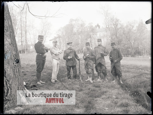 Soldats français et douanier, WW1, plaque verre, photo ancienne, négatif 9x12 cm