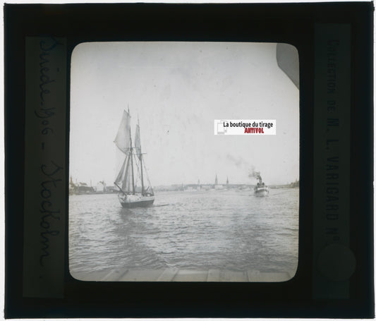 Stockholm, Suède, bateaux, photo plaque verre, noir & blanc, positif 8,5x10 cm
