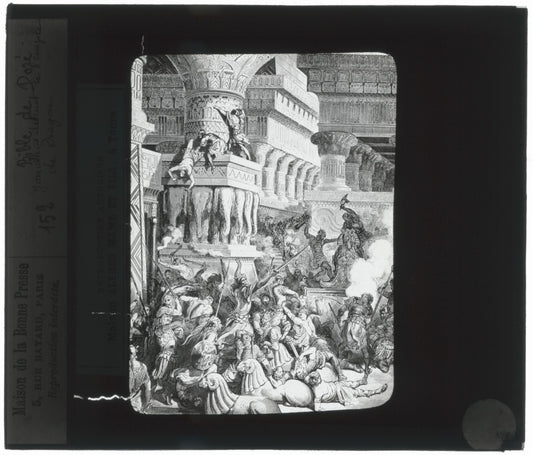 Temple de Dagon, Bible de Doré, dessin, plaque verre, positif 8,5x10 cm