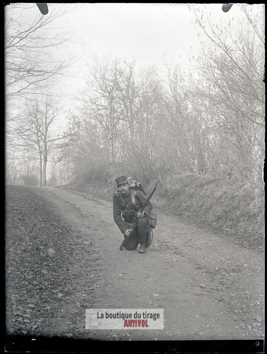 Tirailleur en marche, soldat, plaque verre, photo ancienne, négatif 9x12 cm