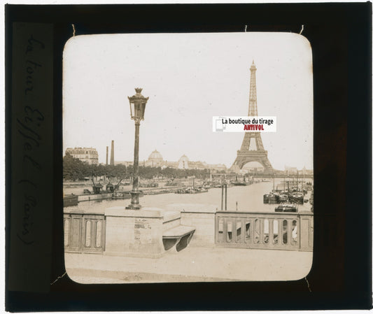Tour Eiffel, la Seine, Paris, photo plaque verre, sépia, positif 8,5x10 cm
