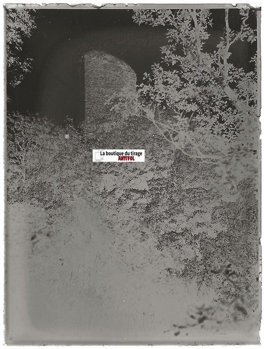 Tour château, ruine, Plaque verre photo ancienne, négatif noir & blanc 9x12 cm