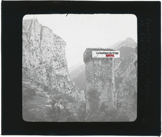 Tour et rocher de Castellane, photo ancienne plaque de verre, positif 8,5x10 cm