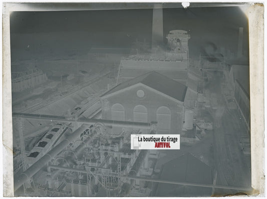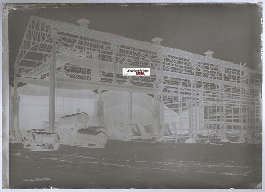 Usine, industrie, photo ancienne plaque verre, négatif noir & blanc, 9x12 cm