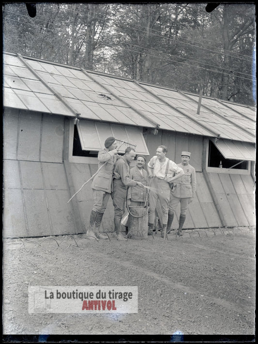 Vie de camp, soldats, WW1, plaque verre, photo ancienne, négatif 9x12 cm