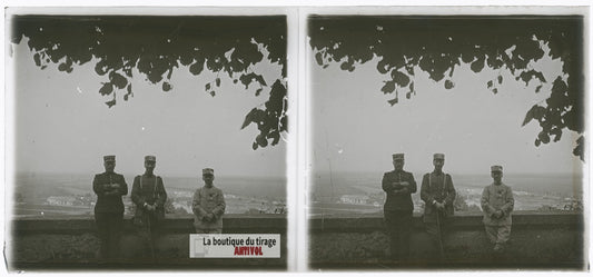 Soldats, parc en hauteur, guerre WW1, plaque verre photo ancienne stéréo 6x13 cm