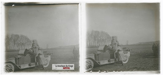 Soldats, voiture, guerre WW1, plaque verre photo ancienne stéréo 6x13 cm