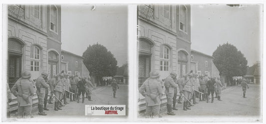 Soldats, village, guerre WW1, plaque verre photo ancienne stéréo 6x13 cm