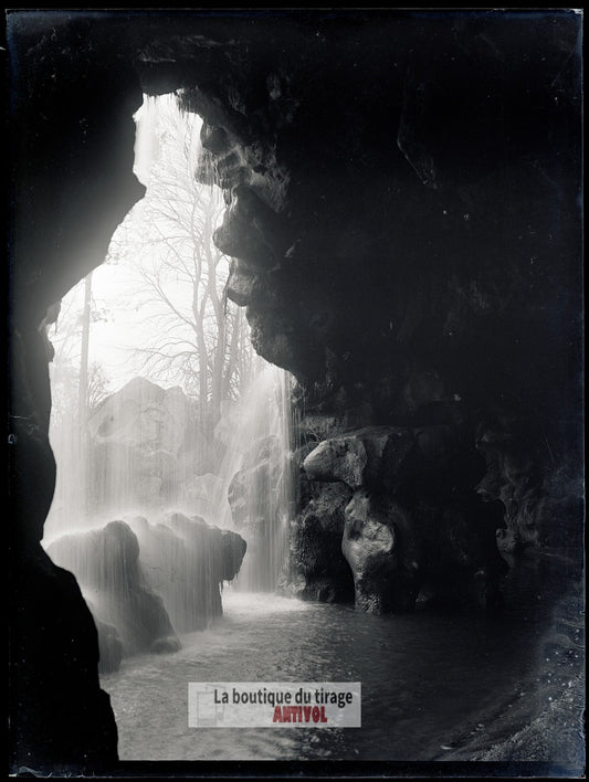 Cascade, Bois de Boulogne, Paris, plaque verre, photo ancienne, négatif 9x12 cm