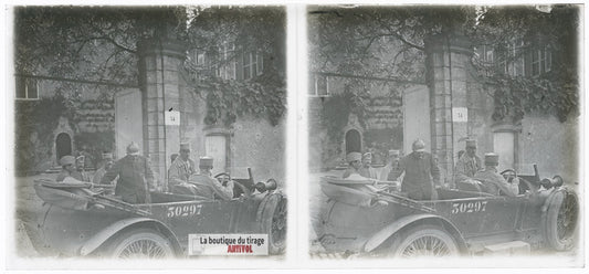 Voiture, officiers, guerre WW1, plaque verre photo ancienne stéréo 6x13 cm