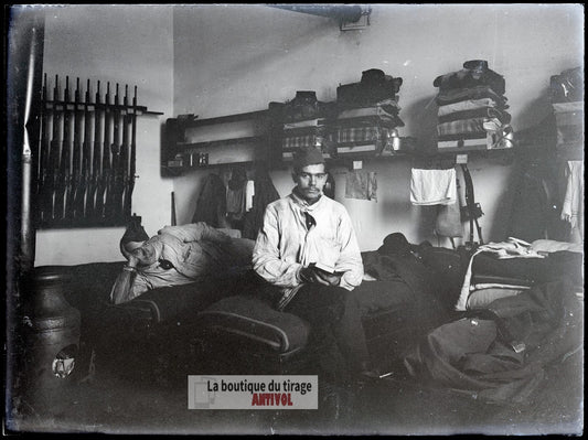 Chambrée militaire, soldats, plaque verre, photo ancienne, négatif 9x12 cm