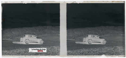 Algérie, voiture, plaque verre, photo stéréo, négatif noir & blanc 6x13 cm
