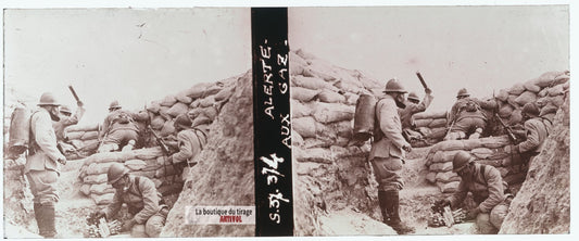 Alerte aux gaz, tranchée guerre WW1, plaque verre stéréo, photo 4,5x10,7 cm