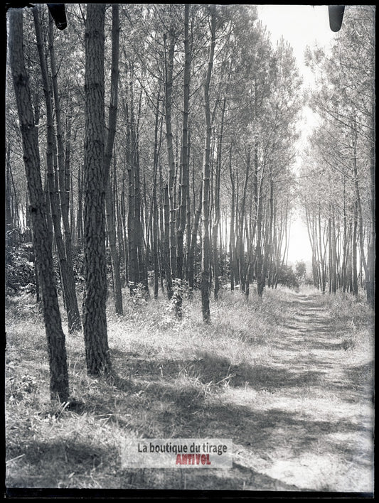 Allée forestière ensoleillée, plaque verre, photo ancienne, négatif 9x12 cm