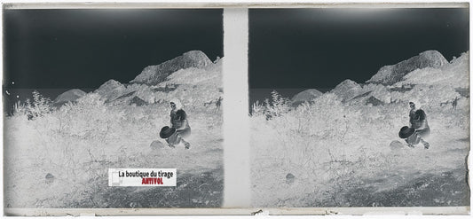 Alpiniste, Alpes Suisse, stéréo photo plaque verre, noir & blanc, 9x12 cm