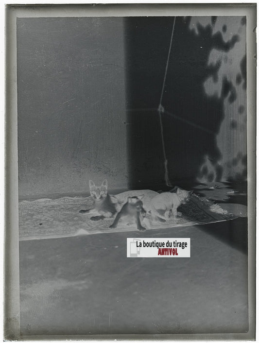 Chat et chatons, photo ancienne plaque verre, négatif noir & blanc, 9x12 cm