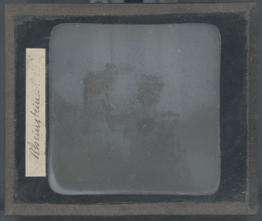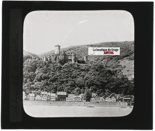 Château de Rheinstein, Rhin, photo plaque verre, noir & blanc, positif 8,5x10 cm